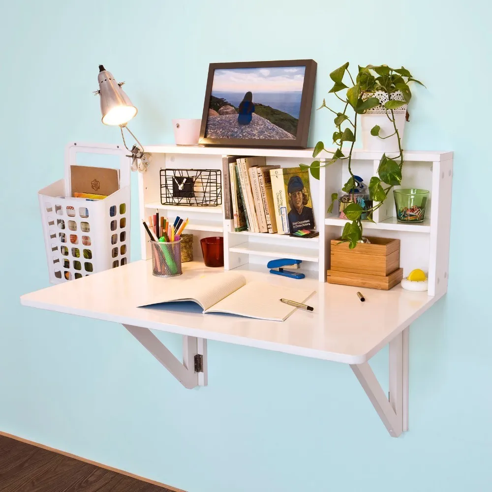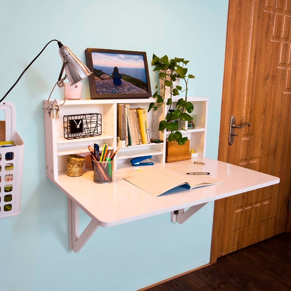 Característica: Nuevo diseño de escritorio plegable montado en la pared, integrado con estantes de almacenamiento . Este artículo proporciona un montón de espacio de almacenamiento con hasta 13 compartimentos, cada uno se ajusta fácilmente según sus necesidades. También es especialmente adecuado como mesa de cocina con estante de especias.
