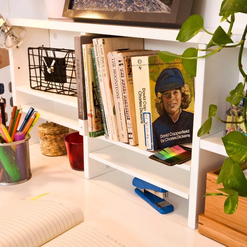 -Descripción- -Material: mesa superior: madera maciza; Tablero de pared: MDF. -Tamaño: 90x60cm. -Color: blanco. -Peso: 13kg. -Capacidad de carga: 20kg.