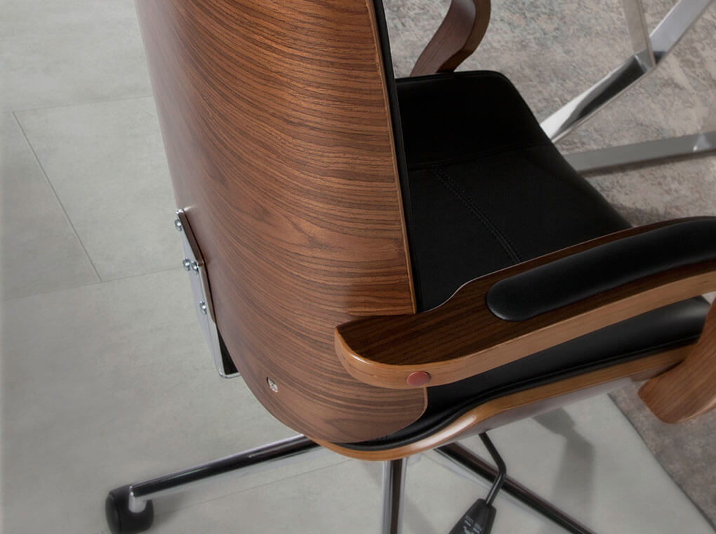 Sillón de oficina tapizado en polipiel color negro simil. Trasera y reposabrazos en MDF chapado en nogal. Sistema giratorio 360º. Altura regulable mediante palanca con mecanismo hidraúlico elevable. Mecanismo reclinable Estructura de acero inoxidable con ruedas. Disponible en stock para envío inmediato. Envío directamente desde la fábrica. 2 años de garantía para defectos de fabricación. Medidas: 62 x 68 x 116/124
